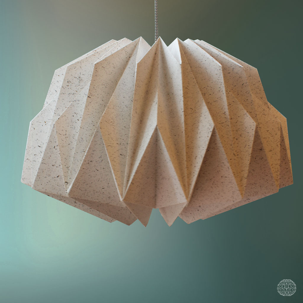 De Ilyas M is verkrijgbaar in meerdere uitvoeringen: wit, zandbruin, tomatenplantenpapier en nu ook in zeewierpapier. Elk materiaal geeft zijn eigen sfeer, maar steeds herken je hetzelfde beproefde model.