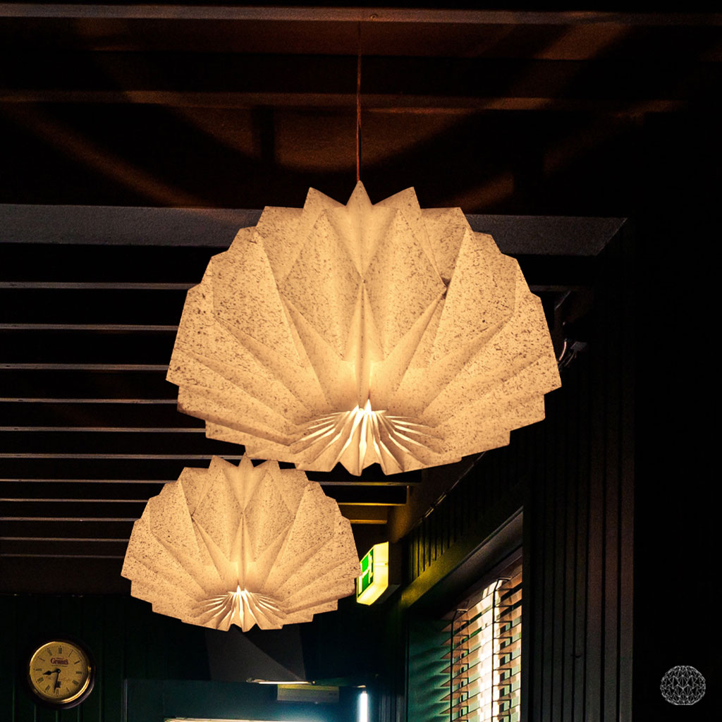 Overdag, met het licht uit, staat de Ilyas M al mooi op zichzelf: een object met karakter, waarin de grove vezels direct zichtbaar zijn. ’s Avonds, zodra het licht aangaat, verandert het beeld. Het papier gloeit warm op en het licht zoekt zijn weg tussen de vezels door. De geometrische vouwen versterken dit spel van licht en donker, waardoor de lamp een levendig en krachtig lichtbeeld geeft.